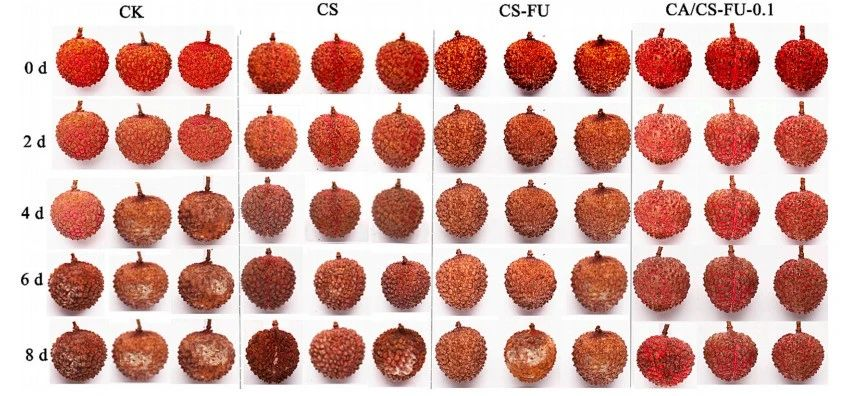 嶺南師范大學劉鍇棟團隊利用殼聚糖(CS)和氧化褐藻糖膠(CS-FU)以及包封肉桂醛(CA) 制備的一種可食用復合薄膜可以顯著提高荔枝的保鮮時間(>8 天)(文獻圖片)