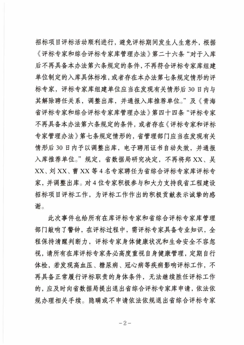 通報(bào)表示,評標(biāo)工作責(zé)任重、強(qiáng)度高,評標(biāo)時(shí)長不確定,時(shí)常需加班加點(diǎn)延時(shí)評標(biāo),甚至隔夜評標(biāo),對評標(biāo)專家身體健康狀況要求較高,專家身體健康是確保評標(biāo)活動(dòng)順利進(jìn)行和評標(biāo)質(zhì)量的根本保證。本著對評標(biāo)專家個(gè)人身體健康和生命安全負(fù)責(zé),保障每一個(gè)招標(biāo)項(xiàng)目評標(biāo)活動(dòng)順利進(jìn)行,避免評標(biāo)期間發(fā)生人身意外,青海省數(shù)據(jù)局研究決定,不再將該4名專家聘任為省綜合評標(biāo)專家?guī)煸u標(biāo)專家,并調(diào)整出庫。