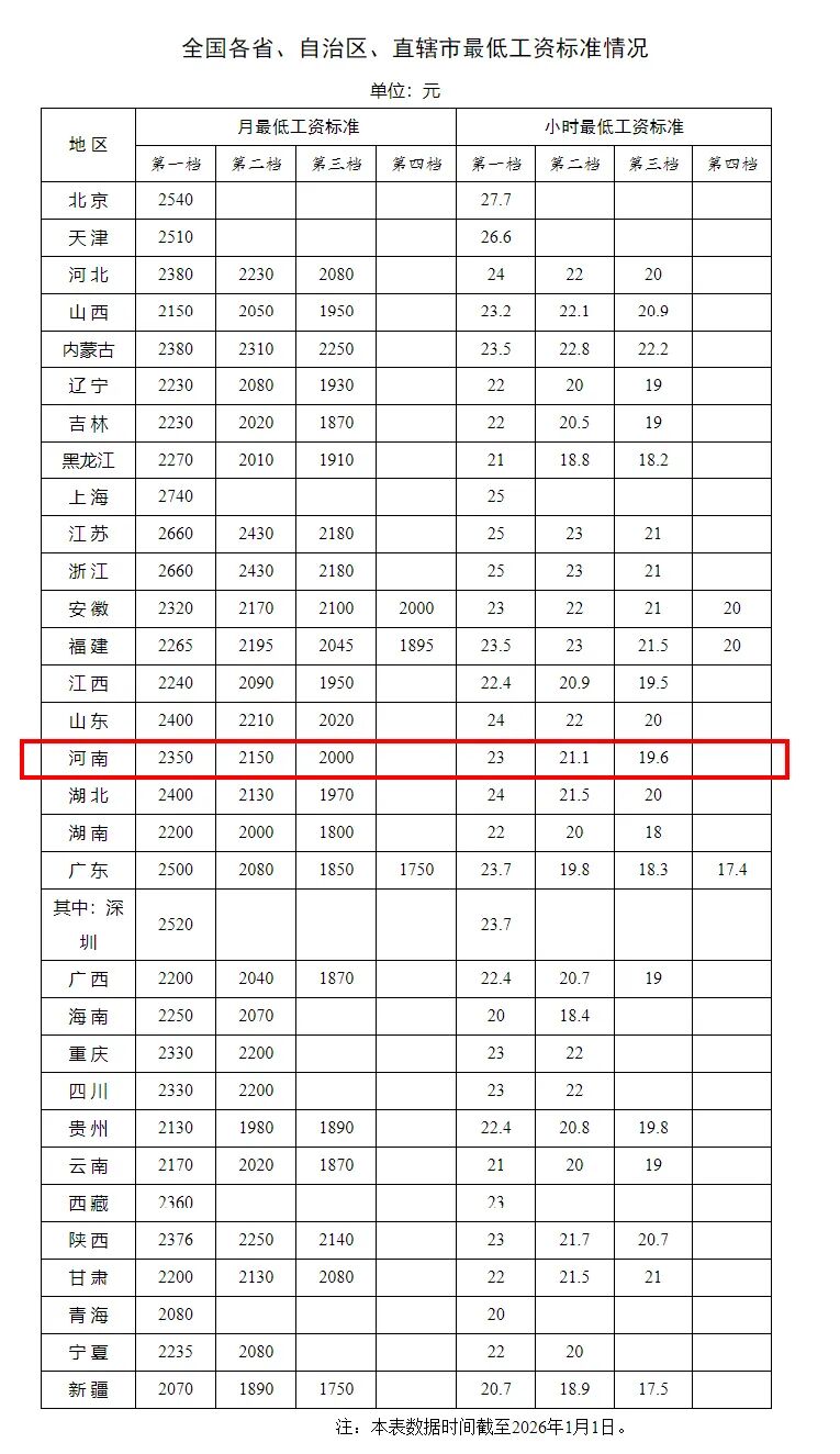 其中,河南第一檔月最低工資標準為2350元,第一檔小時最低工資標準為23元。