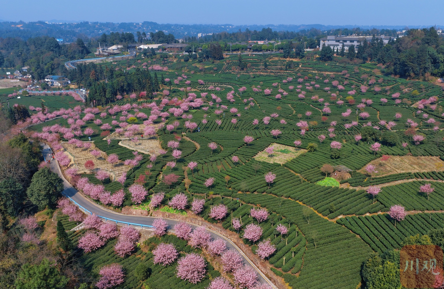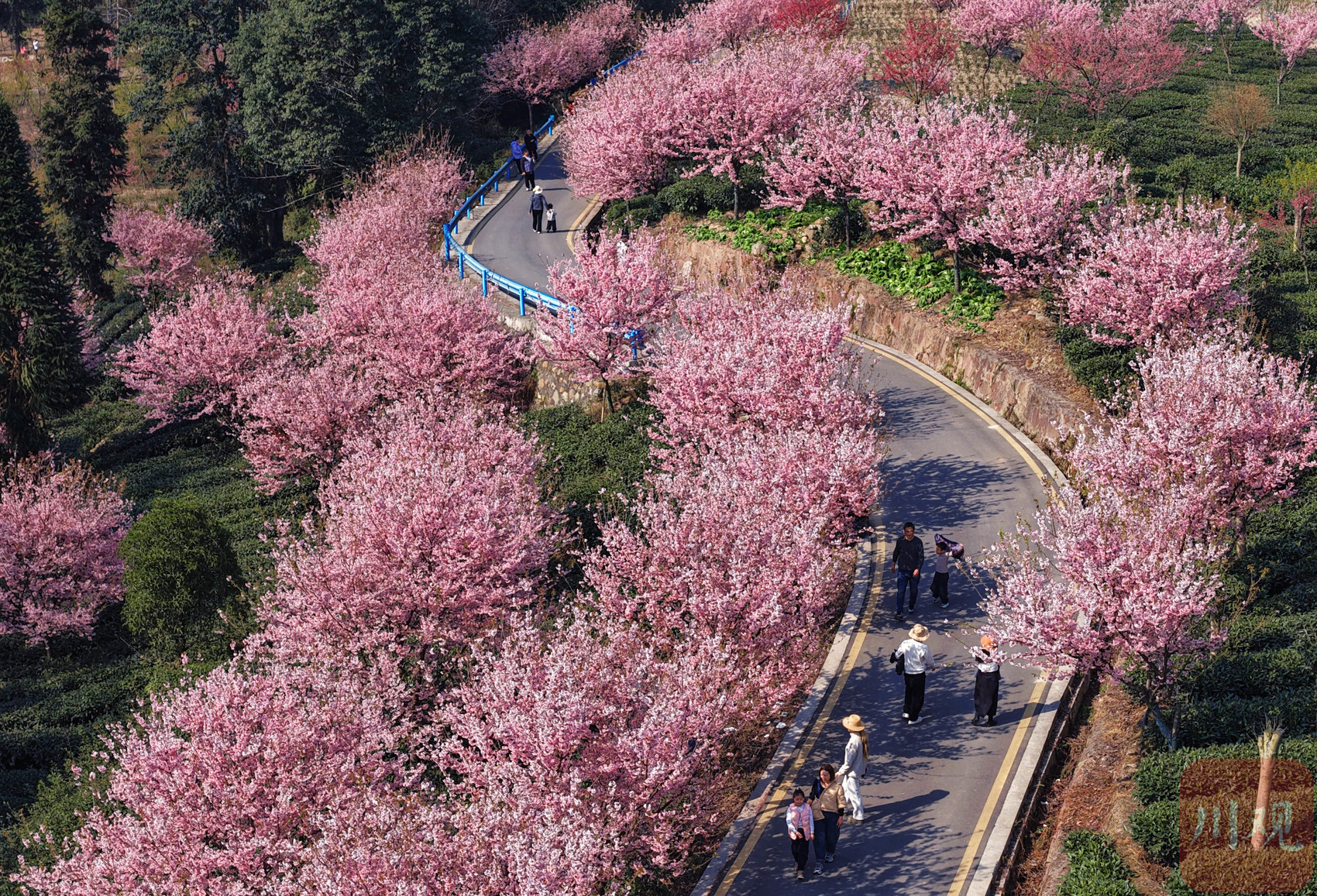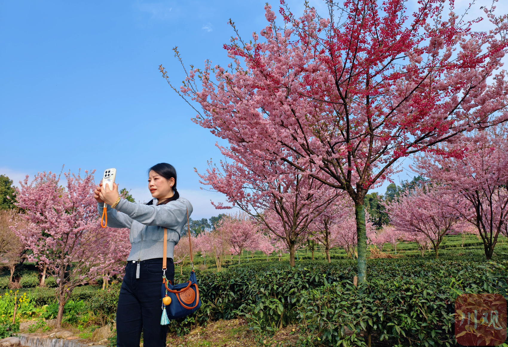2月20日,農歷大年初四,雅安市名山區新店鎮龍灘子景區櫻花迎來盛花期。粉白交織的櫻花與層層疊疊的翠綠茶園交相輝映,構成一幅春日畫卷,吸引眾多游客前來踏青賞花,樂享新春假期。
