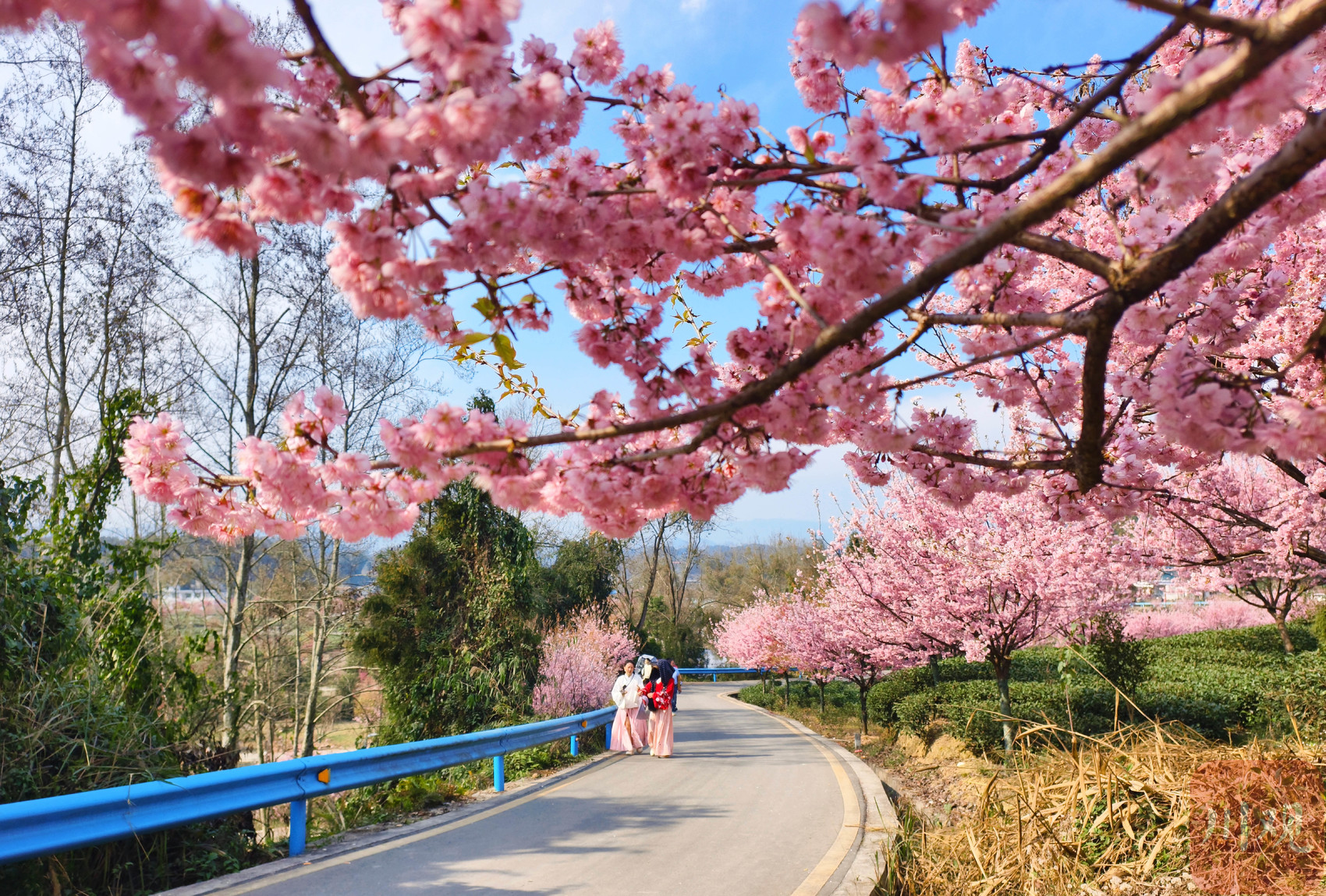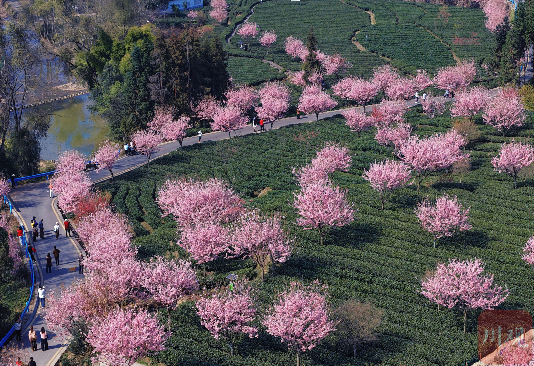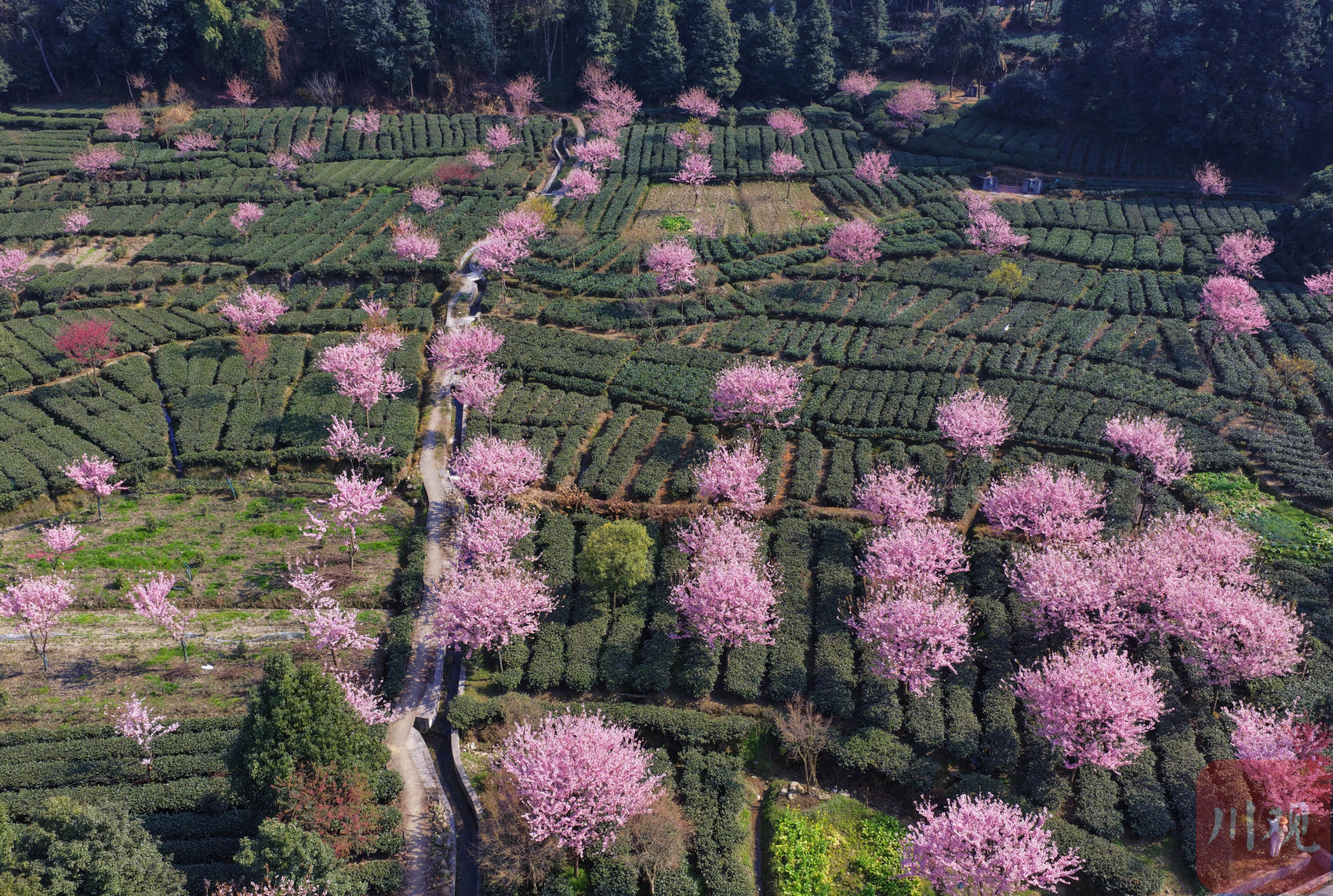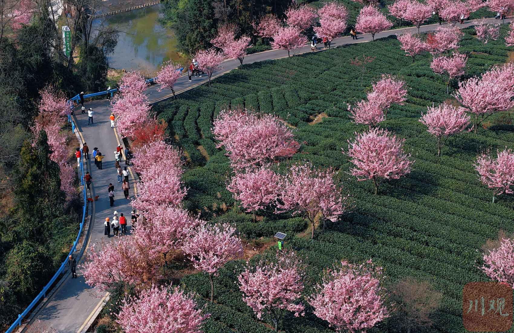 2月20日,農歷大年初四,雅安市名山區新店鎮龍灘子景區櫻花迎來盛花期。粉白交織的櫻花與層層疊疊的翠綠茶園交相輝映,構成一幅春日畫卷,吸引眾多游客前來踏青賞花,樂享新春假期。