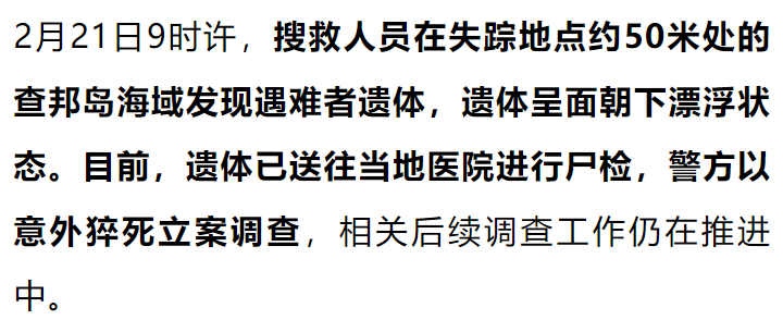 據報道,當地時間2月20日17時30分許,該男子獨自下水,游向附近的查邦島,未告知家人具體路線與時長。約半小時后,兒子發現父親遲遲未歸,海面只看見一頂漂浮的帽子,隨即報警求助。
