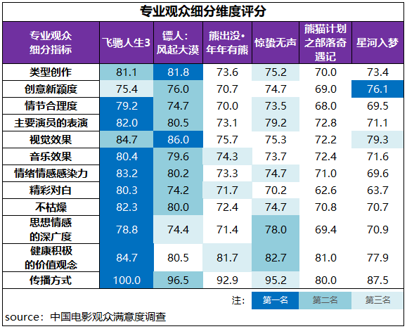 專業觀眾評價中,《飛馳人生3》獲得了12項指標中的9項最高分評價,其中情緒情感感染力、健康積極的價值觀念、不枯燥、主要演員表演得分都超過82分;《鏢人:風起大漠》的類型創作、視覺效果居首位,其中視覺效果以86分創下了整個檔期專業觀眾細分指標(不含傳播方式)中的最高分;《星河入夢》的創意新穎度居首位。