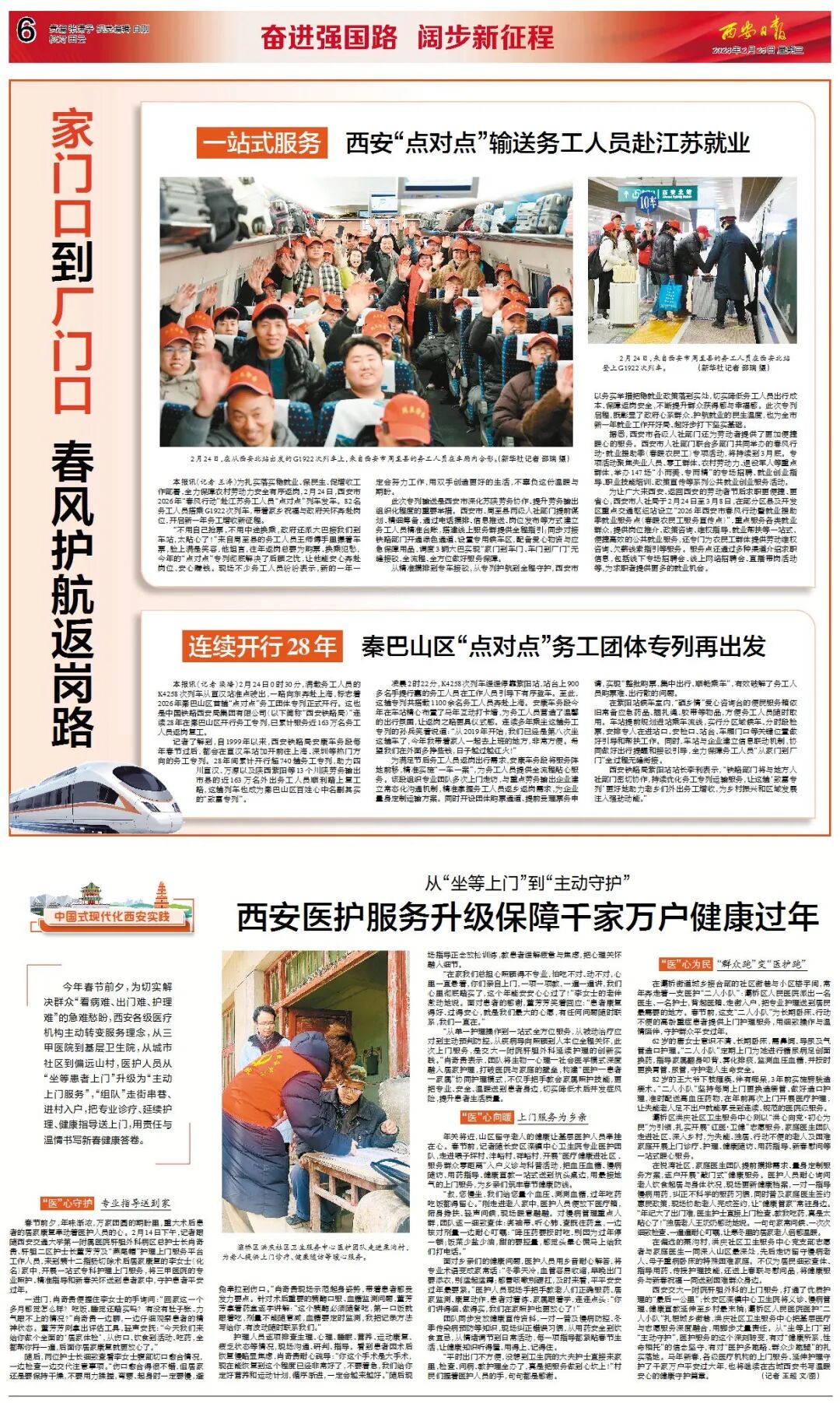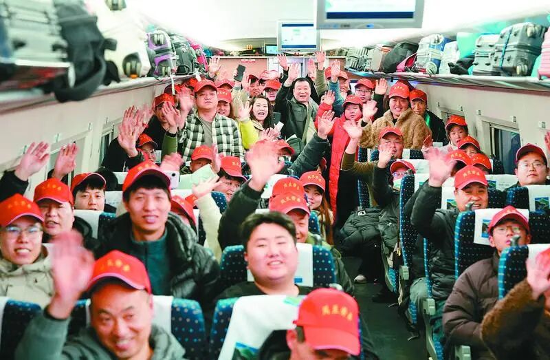 為扎實落實穩(wěn)就業(yè)、保民生、促增收工作部署,全力保障農(nóng)村勞動力安全有序返崗,2月24日,西安市2026年“春風行動”赴江蘇務工人員“點對點”列車發(fā)車。82名務工人員搭乘G1922次列車,帶著家鄉(xiāng)祝福與政府關懷奔赴崗位,開啟新一年務工增收新征程。圖為2月24日,在從西安北站出發(fā)的G1922次列車上,來自西安市周至縣的務工人員在車廂內(nèi)合影。(新華社記者 邵瑞 攝)
