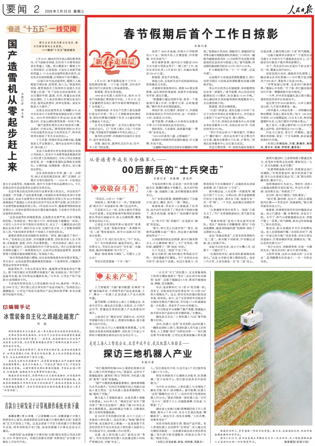 2月25日,人民日報第02版刊發文章《春節假期后首個工作日掠影(新春走基層)》,版面圖及全文如下: