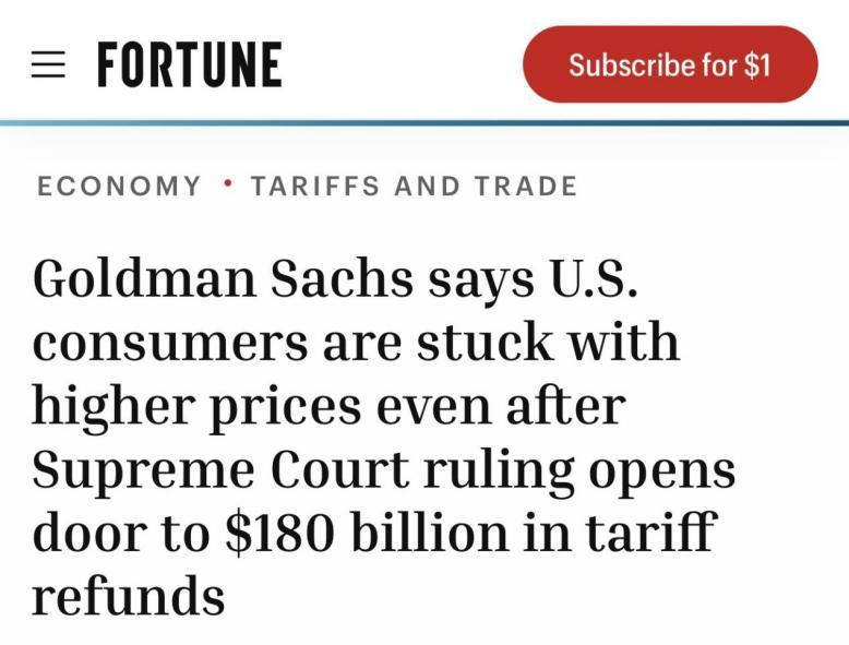 高盛認(rèn)為,美國聯(lián)邦最高法院做出裁決之后,美國消費(fèi)者能夠節(jié)省自身開支的可能性很小,這在很大程度上是因?yàn)樘乩势照忠罁?jù)《1974年貿(mào)易法》第122條款,征收“全球進(jìn)口關(guān)稅”,稅率起初為10%,僅僅一天后就提高到了15%。