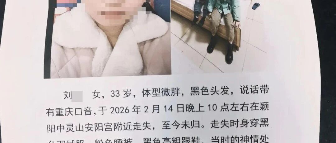 根據家屬發布的尋人啟事,劉某,女,33歲,體型微胖,黑色頭發,說話帶有重慶口音,于2026年2月14日晚上10點左右,在潁陽鎮中靈山安陽宮附近走失,至今未歸。走失時身穿黑色羽絨服,粉色睡褲,黑色高粗跟鞋。劉某當時的神情處在恐懼狀態,說話表達不清楚。如有見到請幫忙聯系家屬,家人十分著急,必定重謝,感激不盡。