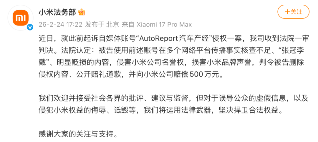 2月24日,@小米法務部 在微博發文稱,就此前起訴自媒體賬號“AutoReport汽車產經”侵權一案,近日小米公司收到法院一審判決。