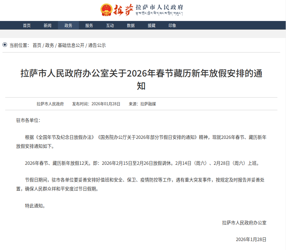 2026年春節、藏歷新年放假12天