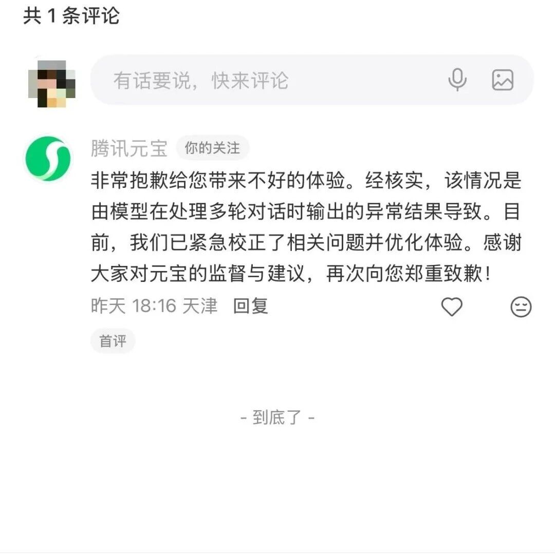 25日,記者從騰訊方面獲悉,經(jīng)核實(shí),該情況是由模型在處理多輪對(duì)話時(shí)輸出的異常結(jié)果導(dǎo)致。目前,元寶團(tuán)隊(duì)已緊急校正了相關(guān)問題并優(yōu)化體驗(yàn)。元寶團(tuán)隊(duì)表示,感謝大家對(duì)元寶的監(jiān)督與建議,再次向用戶鄭重致歉!