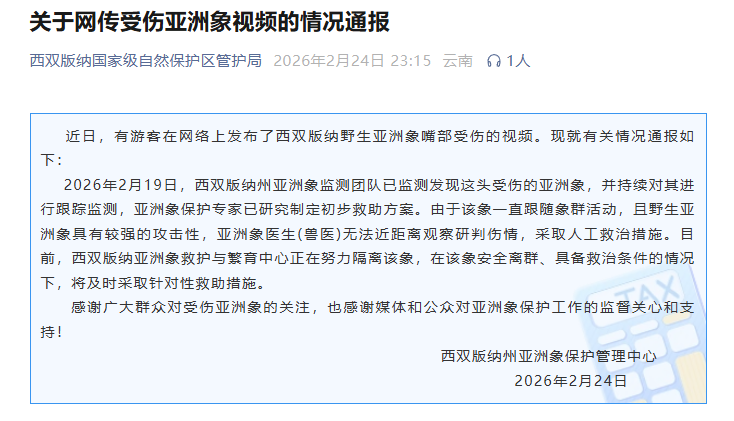 近日,有游客在網絡上發布了西雙版納野生亞洲象嘴部受傷的視頻。西雙版納州亞洲象保護管理中心2月24日晚發布情況通報: