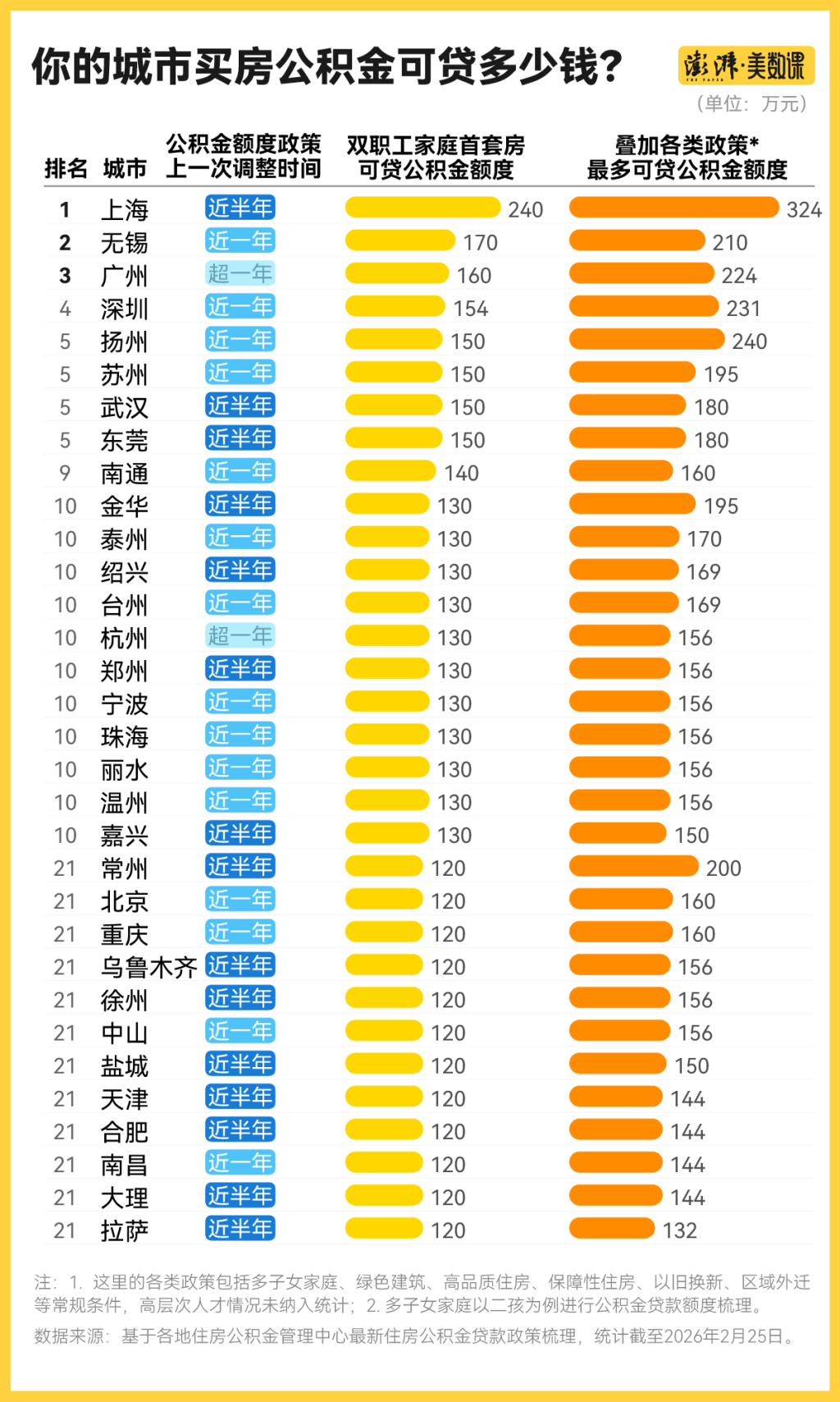澎湃美數課工作室梳理,目前全國至少已有32個城市將雙職工家庭首套房可貸公積金額度設置為120萬元及以上,其中有8個城市的額度達150萬元。