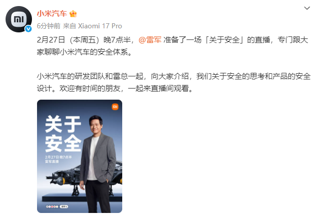 隨后雷軍也發文宣布:我準備在2月27日晚7:30開一場直播,就在小米汽車工廠里,專題跟大家聊聊小米汽車的安全體系。