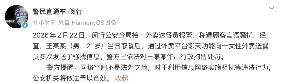 2026年2月22日,閔行公安分局接一外賣送餐員報(bào)警,稱遭顧客言語騷擾。經(jīng)查,王某某(男,21歲)當(dāng)日取餐后,通過外賣平臺聊天功能向一女性外賣送餐員多次發(fā)送了騷擾信息。警方已依法對王某某作出行政拘留處罰。