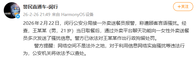 2月26日晚,@警民直通車-閔行 發布警情通報:2026年2月22日,閔行公安分局接一外賣送餐員報警,稱遭顧客言語騷擾。經查,王某某(男,21歲)當日取餐后,通過外賣平臺聊天功能向一女性外賣送餐員多次發送了騷擾信息。警方已依法對王某某作出行政拘留處罰。