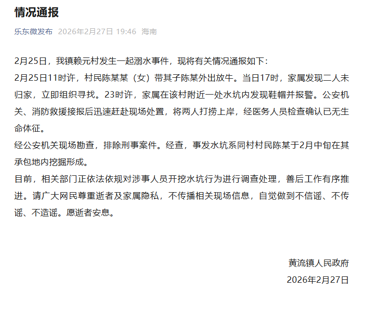 此前,據新京報,2月26日,有網民發視頻稱海南樂東縣一對母子不慎墜入水坑身亡。該網民稱,事發于25日晚,該水坑系田主私自開挖農田采砂。
