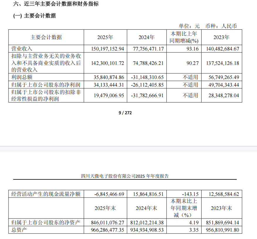 2月27日晚間,*ST天微(下稱:天微電子)正式披露2025年年度報告,成為四川首家交出2025年度經營“成績單”的A股上市公司。報告顯示,公司全年實現營業收入1.5億元,同比增長93.16%;歸母凈利潤3413.34萬元,成功扭虧為盈,核心財務指標已不再觸及退市風險警示標準。公司同步公告,將向上交所申請撤銷退市風險警示(*ST),正式啟動“摘帽”流程,為川股2025年年報季拉開序幕。