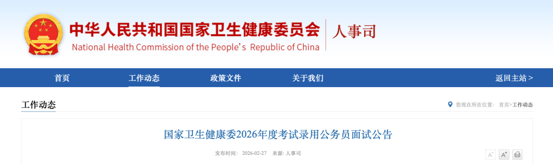 根據(jù)公務員法和公務員考試錄用工作有關規(guī)定,現(xiàn)就國家衛(wèi)生健康委2026年度考試錄用公務員面試有關事宜通知如下: