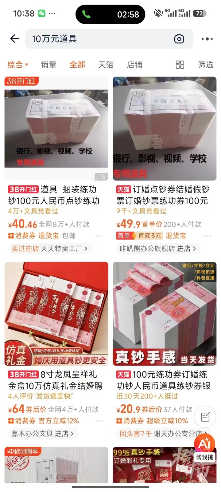 隨后,姚越操在網(wǎng)購(gòu)平臺(tái)搜索“10萬(wàn)元道具”,出現(xiàn)了一批價(jià)值20-60元不等的人民幣道具,他發(fā)現(xiàn),有一家的道具實(shí)拍圖上面也有封簽和紅章,“就連蓋的工作人員的姓名章和行李箱里的也一模一樣?!?/p>