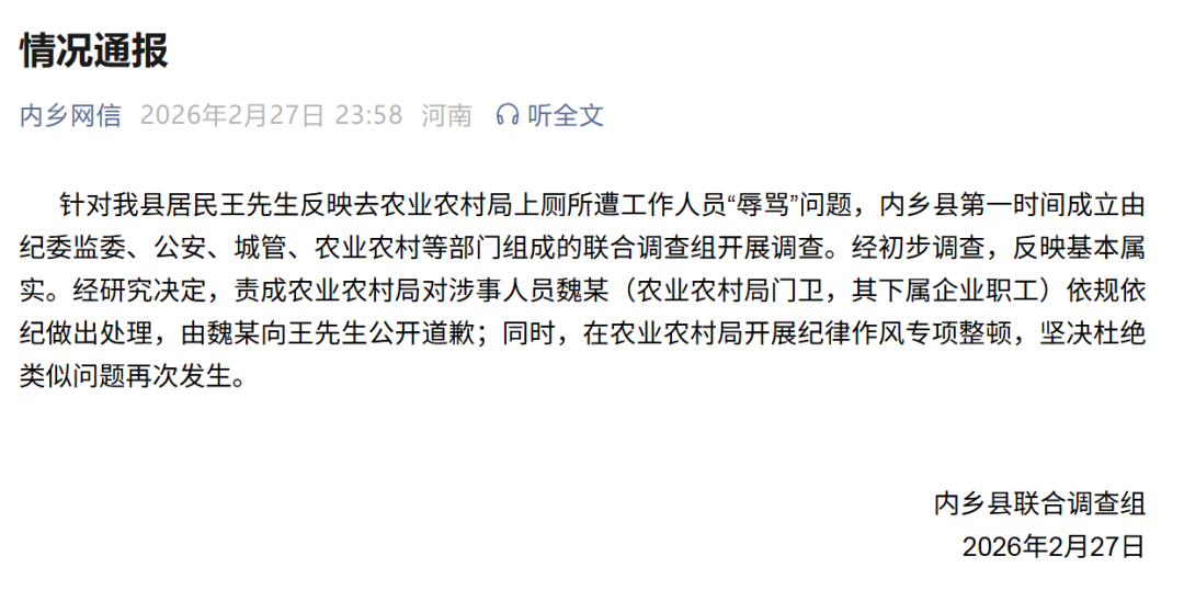 針對(duì)我縣居民王先生反映去農(nóng)業(yè)農(nóng)村局上廁所遭工作人員“辱罵”問(wèn)題,內(nèi)鄉(xiāng)縣第一時(shí)間成立由紀(jì)委監(jiān)委、公安、城管、農(nóng)業(yè)農(nóng)村等部門(mén)組成的聯(lián)合調(diào)查組開(kāi)展調(diào)查。經(jīng)初步調(diào)查,反映基本屬實(shí)。經(jīng)研究決定,責(zé)成農(nóng)業(yè)農(nóng)村局對(duì)涉事人員魏某(農(nóng)業(yè)農(nóng)村局門(mén)衛(wèi),其下屬企業(yè)職工)依規(guī)依紀(jì)做出處理,由魏某向王先生公開(kāi)道歉;同時(shí),在農(nóng)業(yè)農(nóng)村局開(kāi)展紀(jì)律作風(fēng)專(zhuān)項(xiàng)整頓,堅(jiān)決杜絕類(lèi)似問(wèn)題再次發(fā)生。