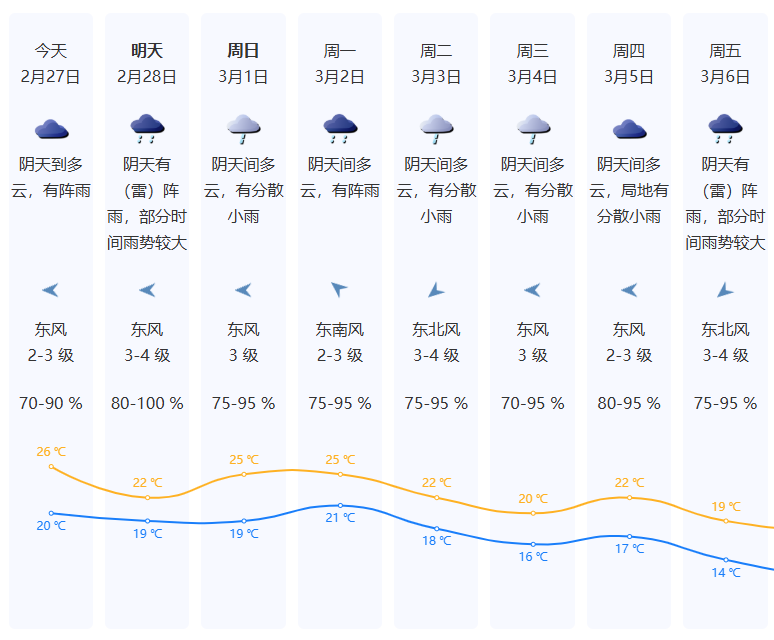 28日陰天有(雷)陣雨,部分時間雨勢較大,可能伴有初雷;