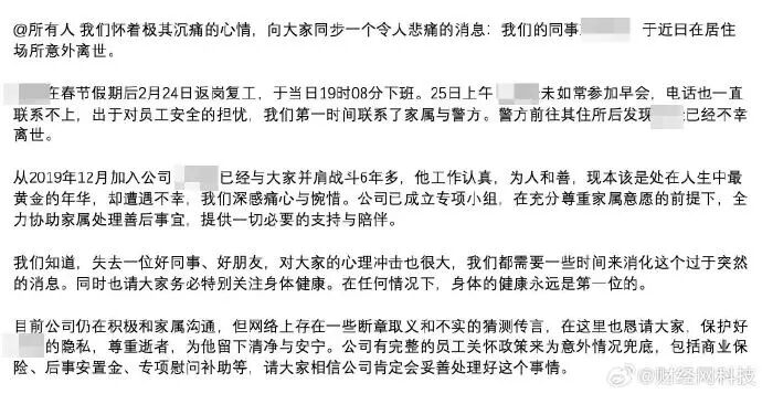 我們懷著極其沉痛的心情,向大家同步一個令人悲痛的消息:我們的同事××意外離世。××在春節假期后于2月24日返崗復工,當日19時08分下班。25日上午××未如常參加早會,電話也一直聯系不上,出于對員工安全的擔憂,我們第一時間聯系了家屬與警方。警方前往其住所后發現:已經不幸離世。從2019年12月加入公司已經與大家并肩戰斗6年多,他工作認真,為人和善,現本該是處在人生中最黃金的年華,卻遭遇不幸,我們深感痛心與惋惜。