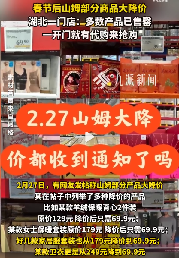 記者以顧客身份咨詢湖北省某山姆門店,工作人員表示,有部分產品降價,但現在熱門產品,比如羊絨保暖背心、保暖套裝、衛衣等都已經沒貨了。其表示門店今天一開門,代購就進來搶購降價產品,不到一小時很多產品就售罄了。至于產品什么時候會降價、降價幅度是多少等問題,上述工作人員表示他們也不知道,都是等統一通知。