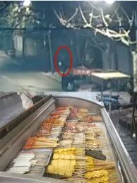 公共監控顯示,男子盜竊了一大包烤串。圖片來源/上海松江警方