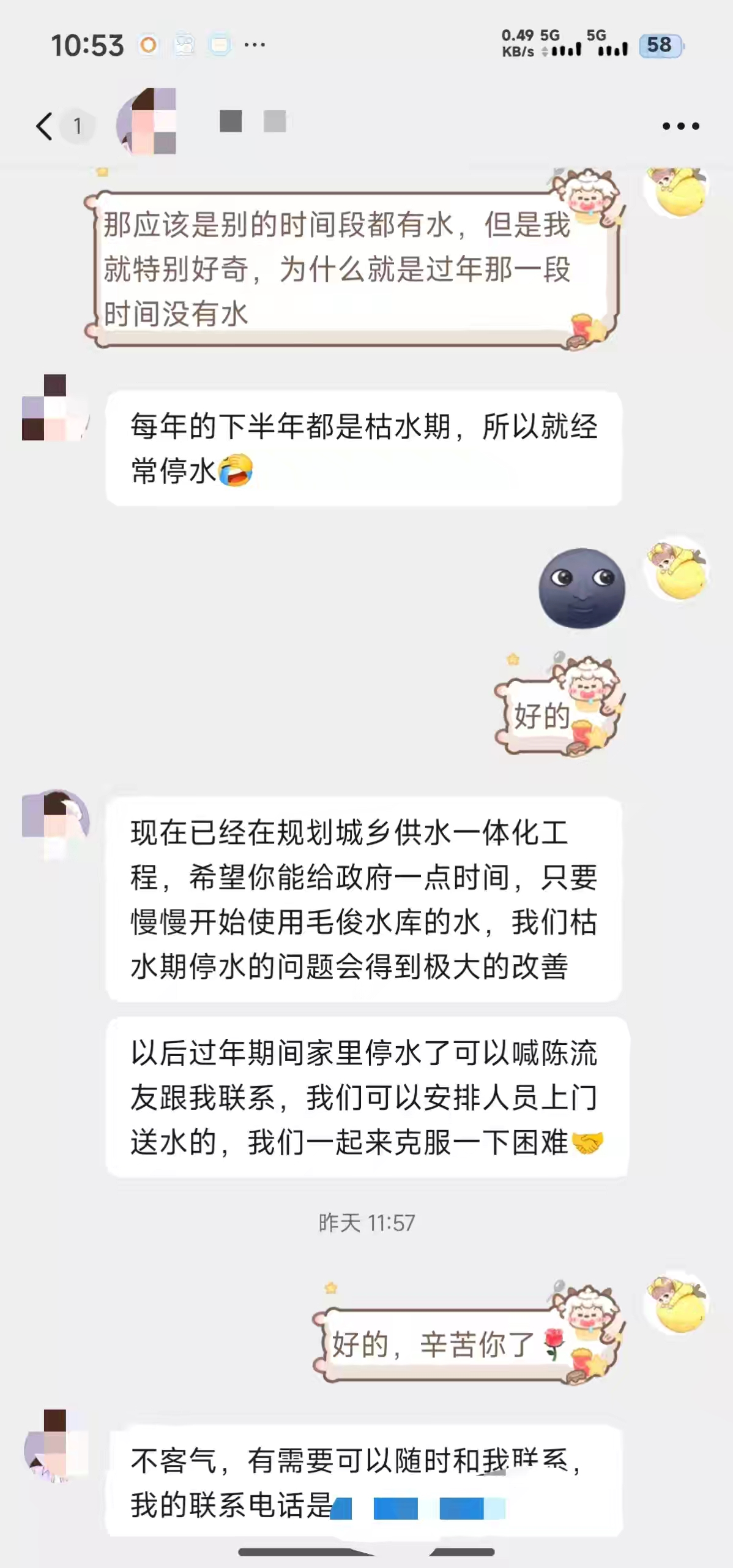 “他們跟我解釋了枯水期停水的原因,并且告訴我等慢慢開始使用毛俊水庫的水后,這個問題就會改善。”鶴川說,“工作人員還留下了自己的電話,告訴我如果沒水了,可以和他聯系,他們安排人上門送水。”