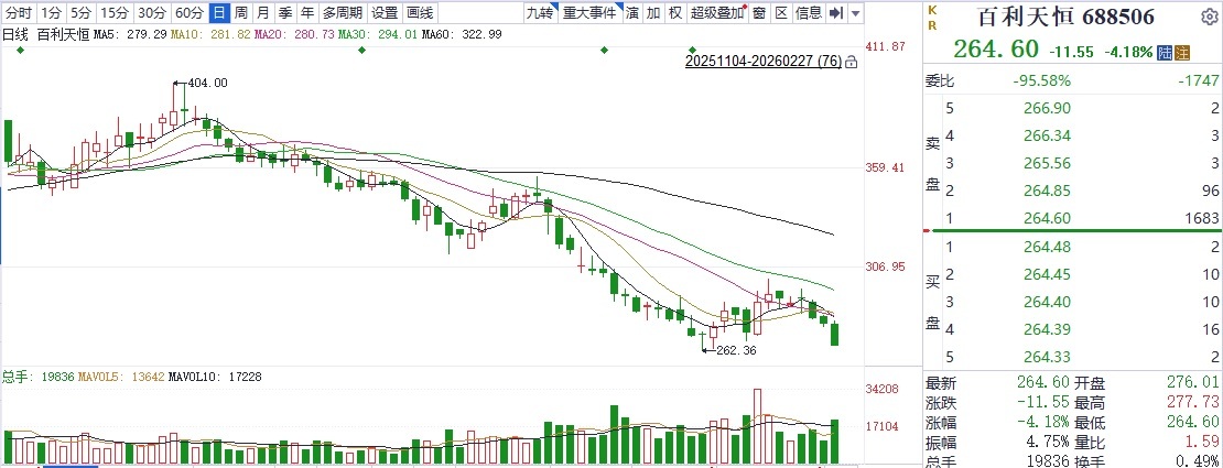 2025年11月25日、26日,百利天恒連續兩日沖擊歷史高點未果后出現回落走勢,在隨后的3個月時間中,公司股價持續震蕩回落,截至2026年2月27日收盤,該股大跌超過4%,股價報收264.6元。就歷史高點算起,本輪回調百利天恒最大跌幅達到36.09%,公司市值萎縮至1092.45億元。
