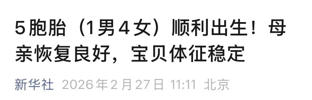 2026年2月26日凌晨,在武漢大學(xué)中南醫(yī)院的手術(shù)室里,接連響起五聲清脆的啼哭。來自新疆的24歲產(chǎn)婦迪麗,順利誕下1男4女五胞胎。醫(yī)學(xué)數(shù)據(jù)顯示,全球自然受孕五胞胎的出生概率僅為六千萬分之一,比中彩票頭獎(jiǎng)還要難上百倍。