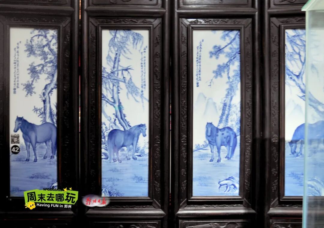 隔著老遠,一座屏風就用別樣的藝術氣息格外的顯眼。走上前去仔細欣賞,發(fā)現(xiàn)竟然是青花大王王步的作品“馬上封侯”瓷板畫。青花發(fā)色淡雅,筆意流暢瀟灑。前以八駿后以靈猴入畫,筆意簡練,取“馬上封侯”吉祥寓意。一組青花瓷板,一組八駿神姿,是近現(xiàn)代青花瓷繪的經(jīng)典之作,也讓馬年的新春充滿了蓬勃的朝氣。