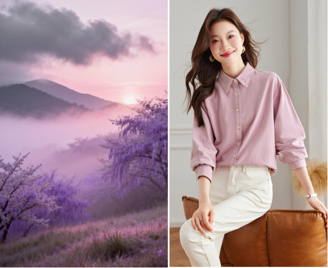 首先來看看薄霧紫藤色,即人們常說的“粉紫色”,一種經過灰度調和而更具質感的浪漫色調。