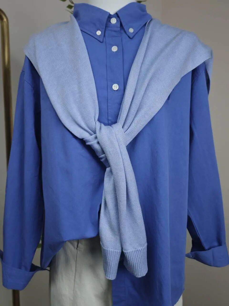 選地中海藍襯衫時,下裝可以做減法,不妨嘗試一下白色、米色、燕麥色、淺灰等中性色,營造干凈清新的感覺。