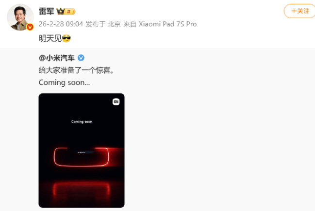2月28日,小米汽車發文:給大家準備了一個驚喜。Coming soon...??隨后,雷軍轉發稱:明天見。