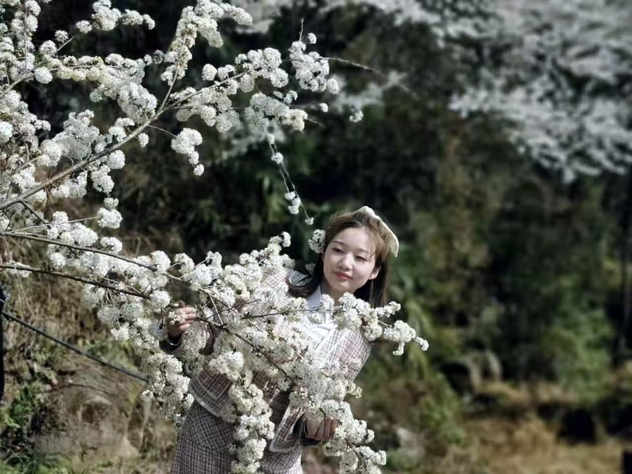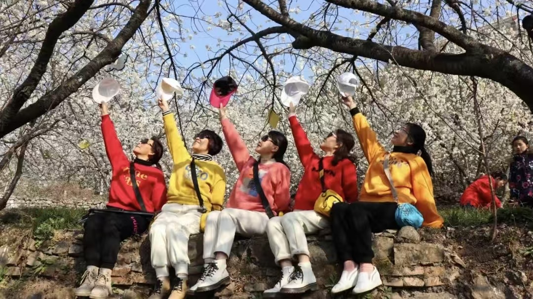 走進(jìn)黃洋鎮(zhèn)金華村,漫山遍野的野櫻花開得熱烈絢爛。微風(fēng)輕拂,花瓣隨風(fēng)輕舞,淡淡花香沁人心脾,吸引各地游客紛至沓來,徜徉花海間拍照打卡、駐足流連?!拔覀兠磕甓家獊磉@里游玩,景色太美了,特別適合拍照?!背啥加慰屠顫χf。