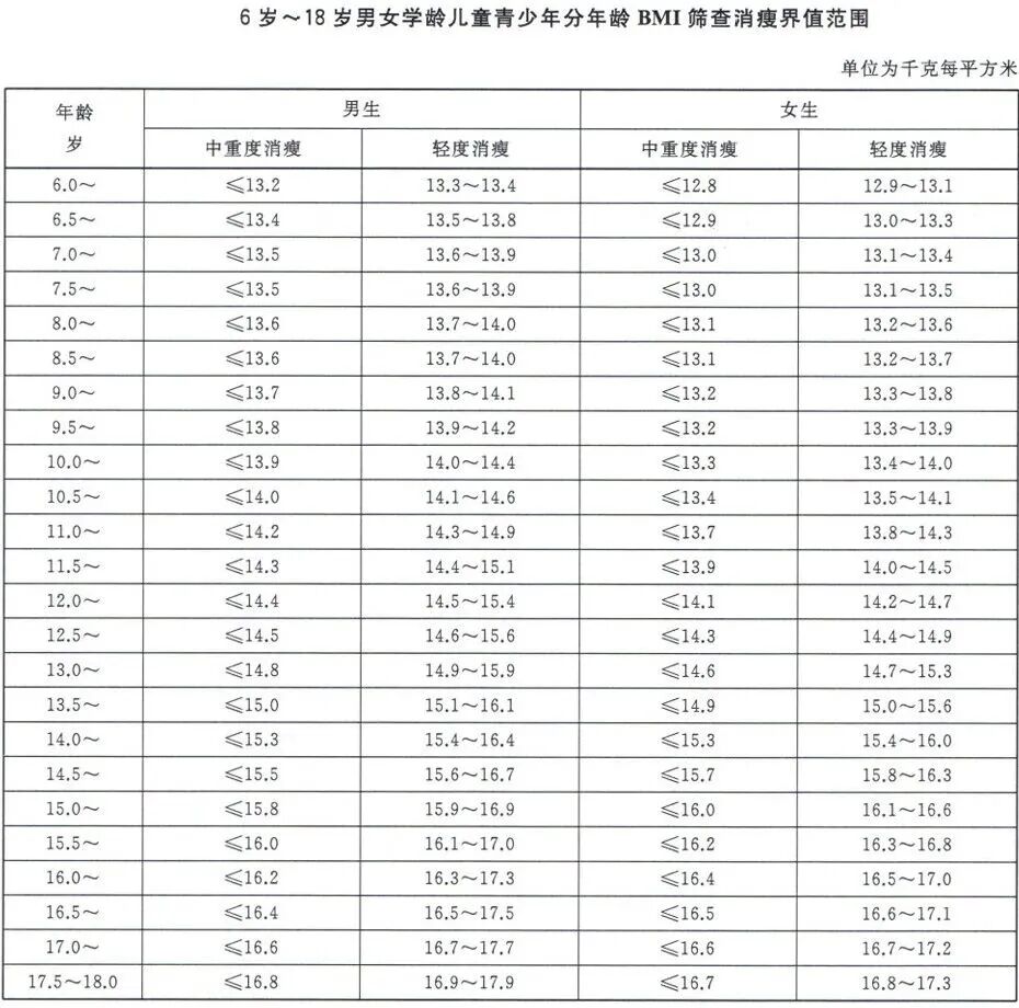 根據中華人民共和國衛(wèi)生行業(yè)標準《學齡兒童青少年營養(yǎng)不良篩查》(WS/T456-2014),消瘦是指體質指數(BMI)低于篩查標準的年齡別BMI界值范圍。家長和學校可通過定期測量身高、體重并計算BMI,參照以下標準進行初步篩查。
