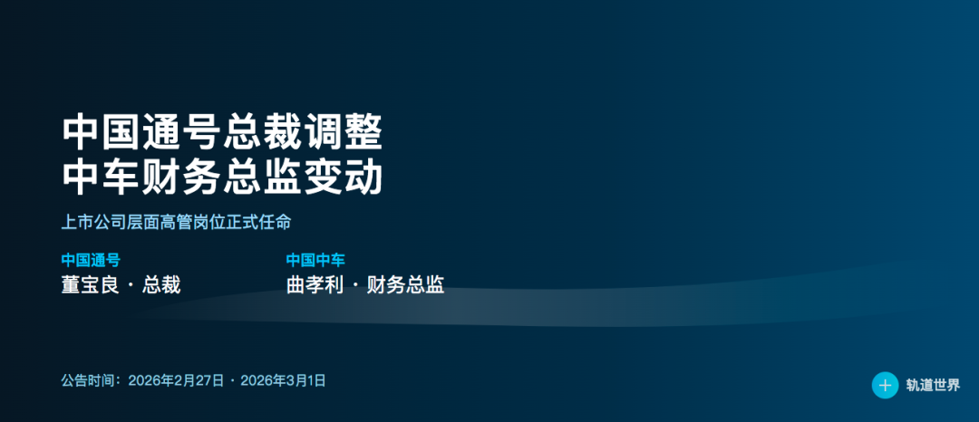 中國中車股份有限公司2026年3月1日發布公告,公司第四屆董事會第七次會議于2026年2月28日召開,審議通過《關于聘任中國中車股份有限公司財務總監(總會計師)的議案》,同意聘任曲孝利先生為公司財務總監(總會計師),任期為自公司董事會審議通過之日起至第四屆董事會任期結束之日止。
