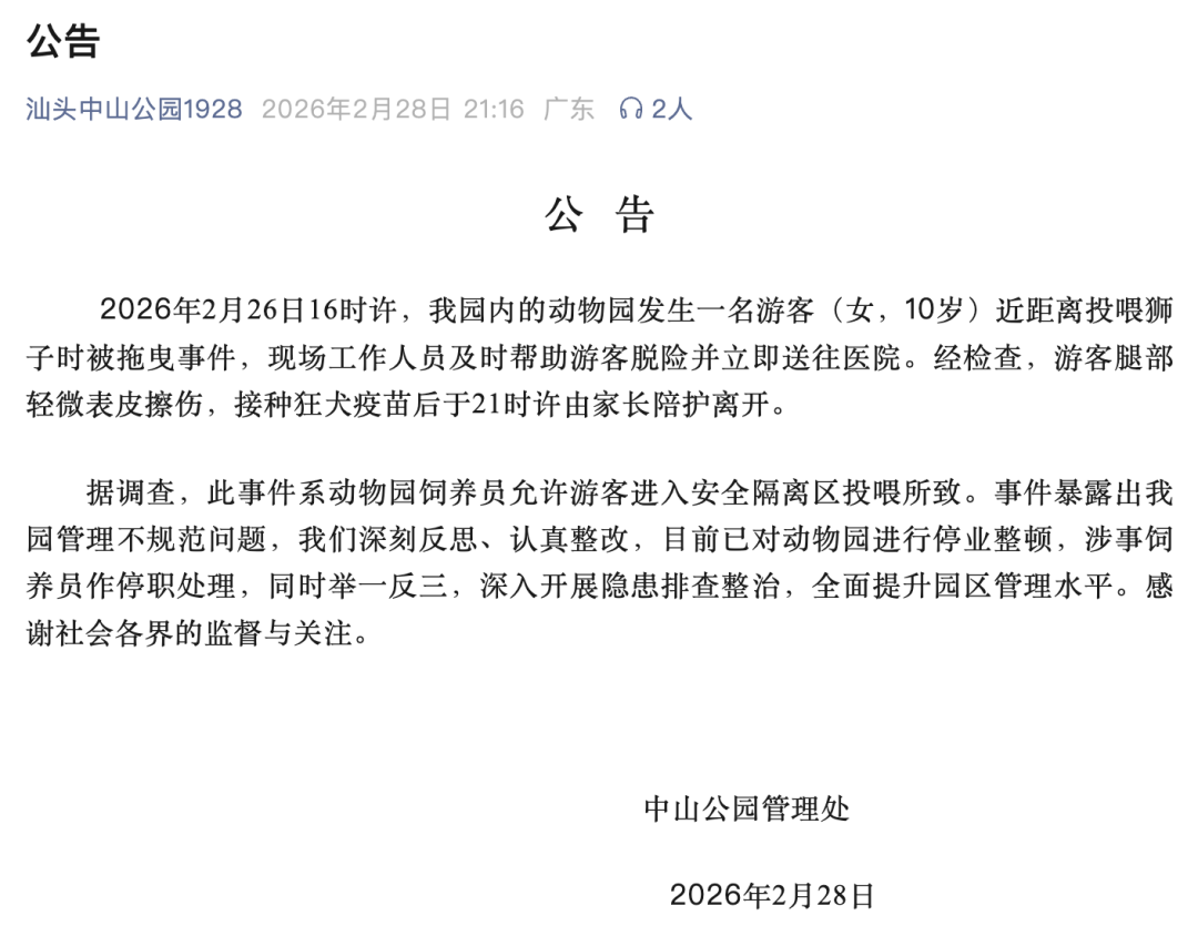 公告稱,2026年2月26日16時許,該公園內的動物園發生一名游客(女,10歲)近距離投喂獅子時被拖曳事件,現場工作人員及時幫助游客脫險并立即送往醫院。經檢查,游客腿部輕微表皮擦傷,接種狂犬疫苗后于21時許由家長陪護離開。