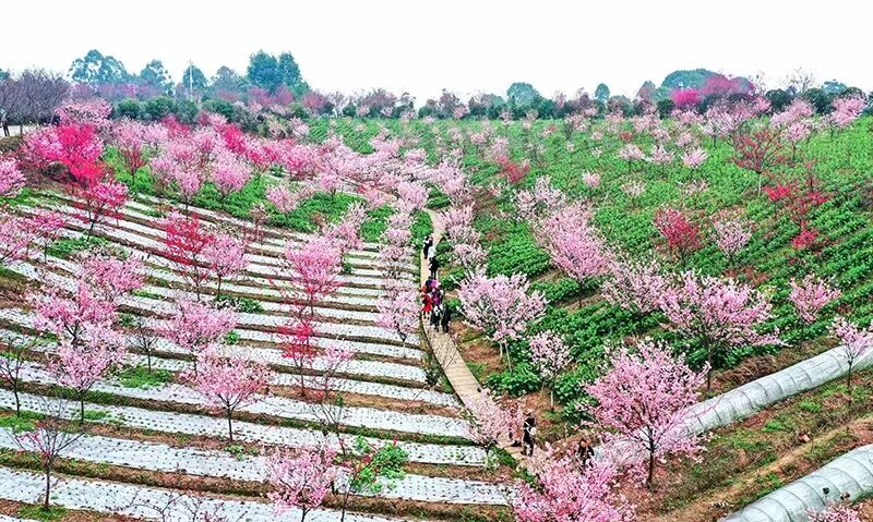 游客在四川省瀘州市江陽區丹林鎮建設村櫻花谷景區游玩。