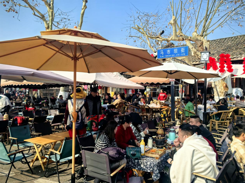 在四川彭鎮古鎮,一壺熱茶、幾碟烤物,伴著田園風光與古鎮煙火,游客放慢腳步,沉浸式感受鄉村慢生活,激活了節假日度假消費,帶動了民宿、餐飲、“土特產”銷售等全鏈條增收。?圖源:中國三農發布記者拍攝