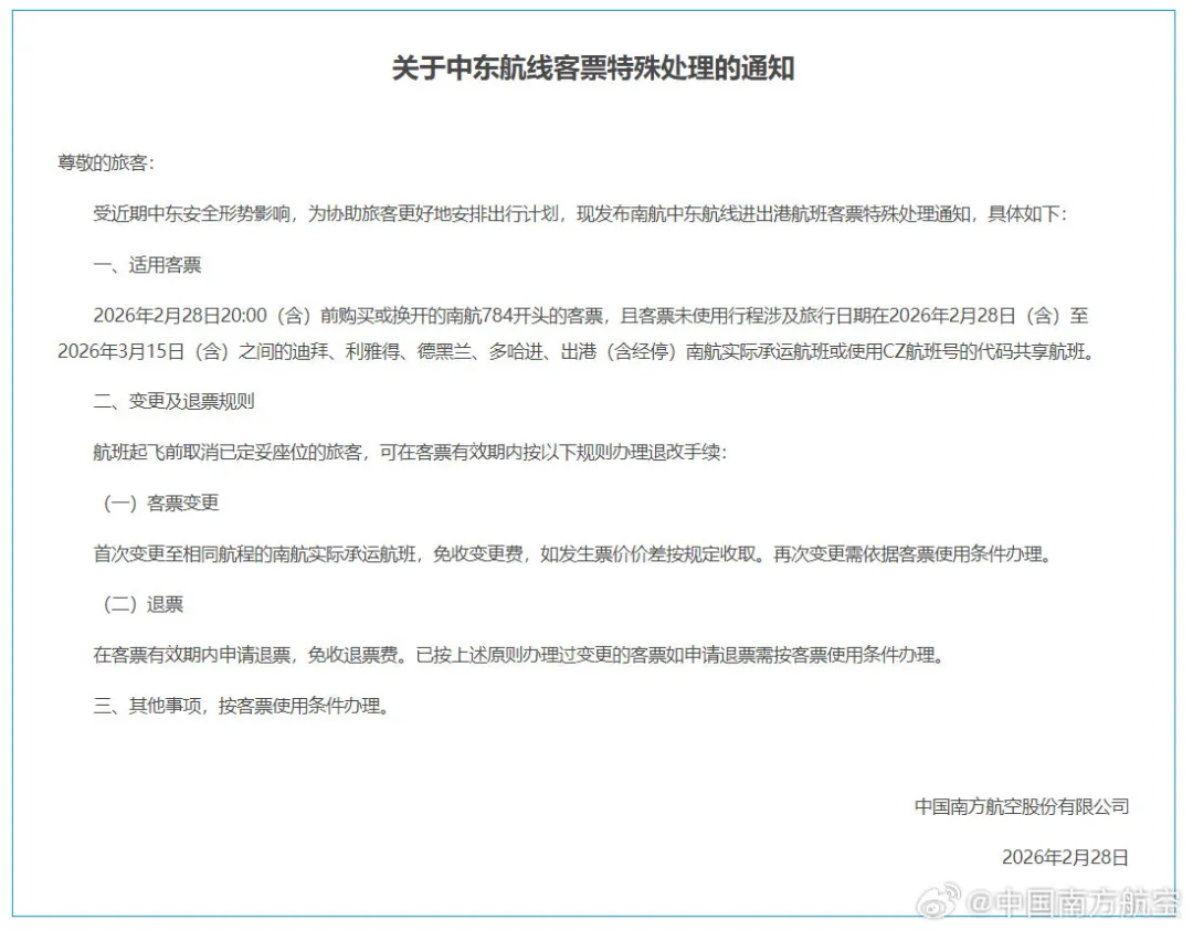 南航發布的“關于中東航線客票特殊處理的通知”顯示,2026年2月28日20:00(含)前購買或換開的南航784開頭的客票,且客票未使用行程涉及旅行日期在2026年2月28日(含)至2026年3月15日(含)之間的迪拜、利雅得、德黑蘭、多哈進、出港(含經停)南航實際承運航班或使用CZ航班號的代碼共享航班,航班起飛前取消已定妥座位的旅客,可在客票有效期內按以下規則辦理退改手續。首次變更至相同航程的南航實際承運航班,免收變更費,如發生票價價差按規定收取。再次變更需依據客票使用條件辦理。在客票有效期內申請退票,免收退票費。已按上述原則辦理過變更的客票如申請退票需按客票使用條件辦理。