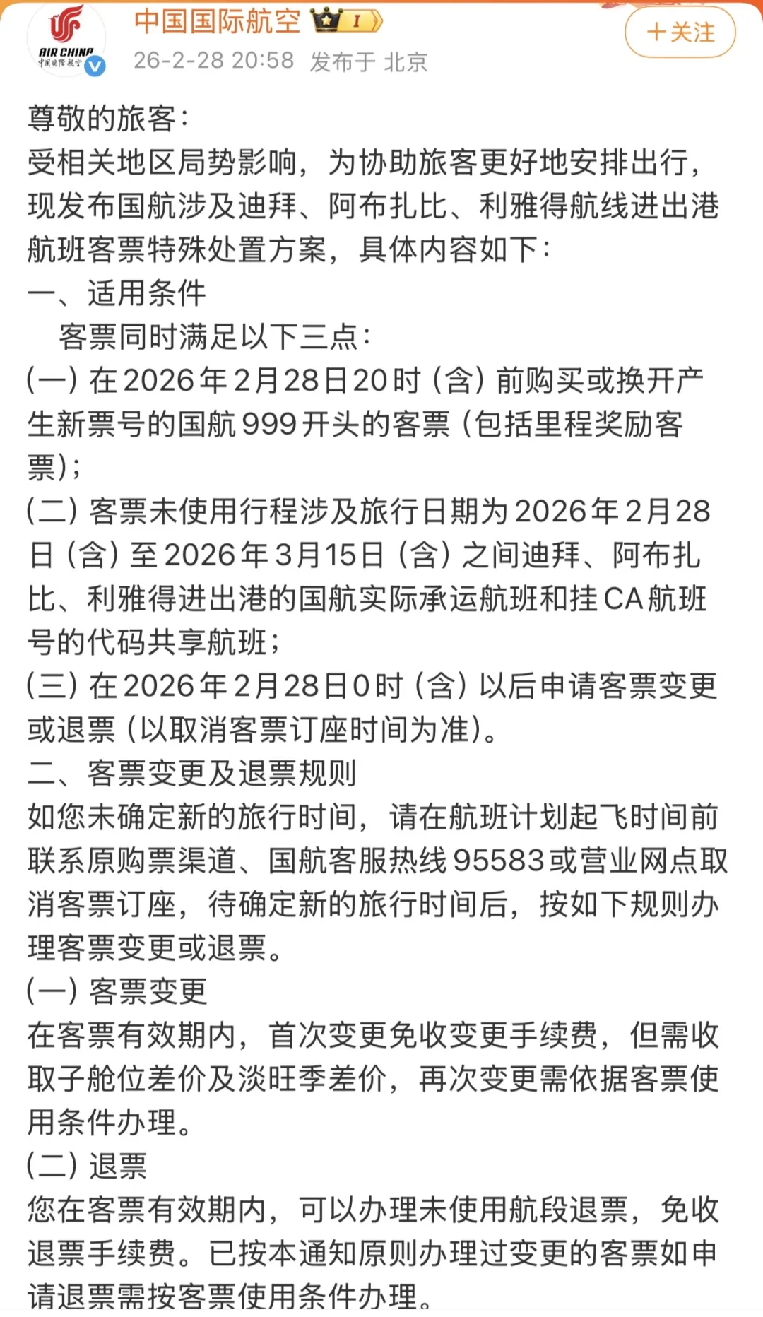 國航發布的“涉及迪拜、阿布扎比、利雅得航線客票特殊處置方案通知”顯示,在2026年2月28日20時(含)前購買或換開產生新票號的國航客票,涉及旅行日期為2026年2月28日(含)至2026年3月15日(含)之間迪拜、阿布扎比、利雅得進出港的國航實際承運航班和掛CA航班號的代碼共享航班可申請客票變更或退票。在客票有效期內,首次變更免收變更手續費,但需收取子艙位差價及淡旺季差價,再次變更需依據客票使用條件辦理。