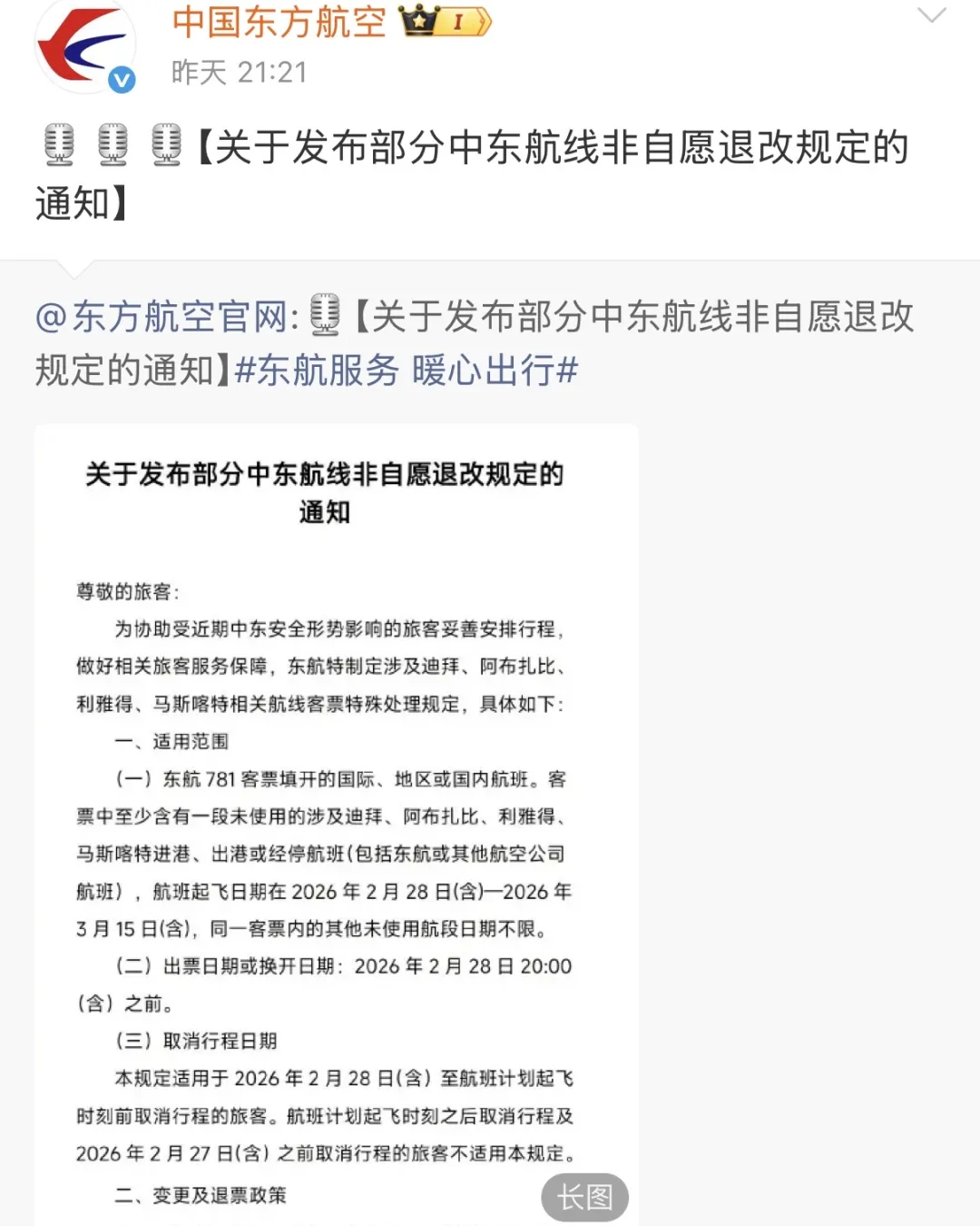 據東航“關于發布部分中東航線非自愿退改規定的通知”顯示,客票中至少含有一段未使用的涉及迪拜、阿布扎比、利雅得、馬斯喀特進港、出港或經停航班(包括東航或其他航空公司航班),航班起飛日期在2026年2月28日(含)—2026年3月15日(含),辦理變更至原航班前后3天(含)以內的航班,可免費變更一次。再次變更或變更超出原航班前后3天(含)內的航班,需依據客票使用條件辦理。