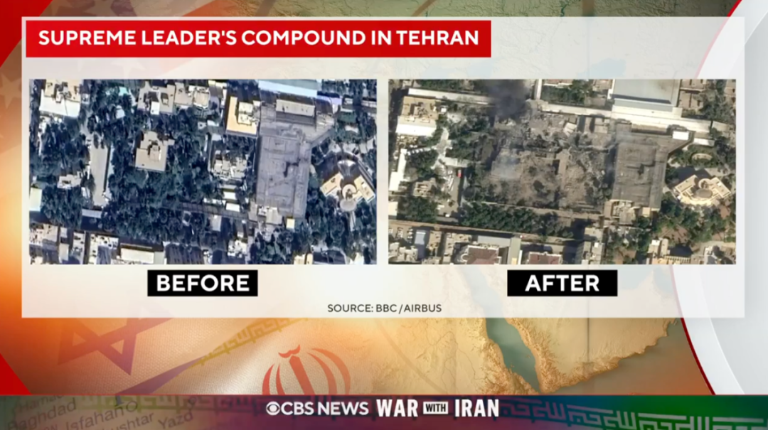 衛星圖顯示哈梅內伊位于德黑蘭的住所遭襲前后的對比景象。圖源:CBS視頻截圖