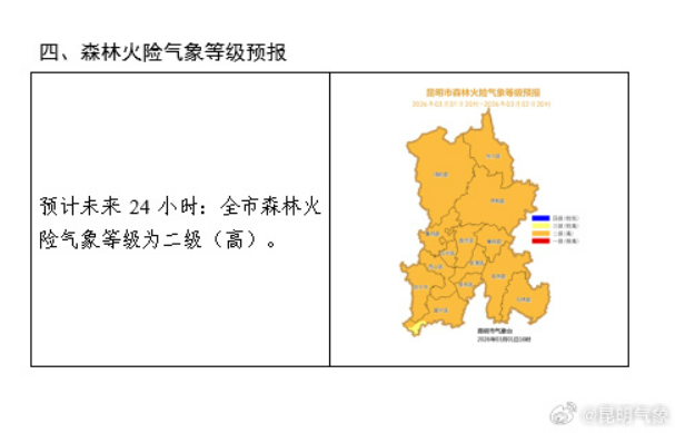 2026年3月1日20時至2026年3月2日20時,麗江市、大理州、楚雄州、昆明市、玉溪市東部和北部、曲靖市中部和南部、紅河州北部、文山州西北部二級(高),怒江州東部和南部、迪慶州東部、保山市、德宏州、臨滄市、普洱市、西雙版納州、玉溪市中部和南部、昭通市南部、曲靖市北部、文山州中部和東部、紅河州中部三級(較高),其他地區(qū)四級(較低)。