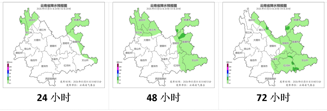 昭通市、曲靖市、昆明市東部、紅河州東部、文山州多云間陰有小雨,怒江州、迪慶州多云有陣雨局部中雨,其中,迪慶州北部山區(qū)有雨夾雪或小雪,其他地區(qū)晴間多云。