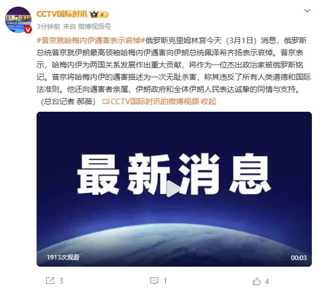 據(jù)CCTV國際時訊,俄羅斯克里姆林宮今天(3月1日)消息,俄羅斯總統(tǒng)普京就伊朗最高領(lǐng)袖哈梅內(nèi)伊遇害向伊朗總統(tǒng)佩澤希齊揚表示哀悼。