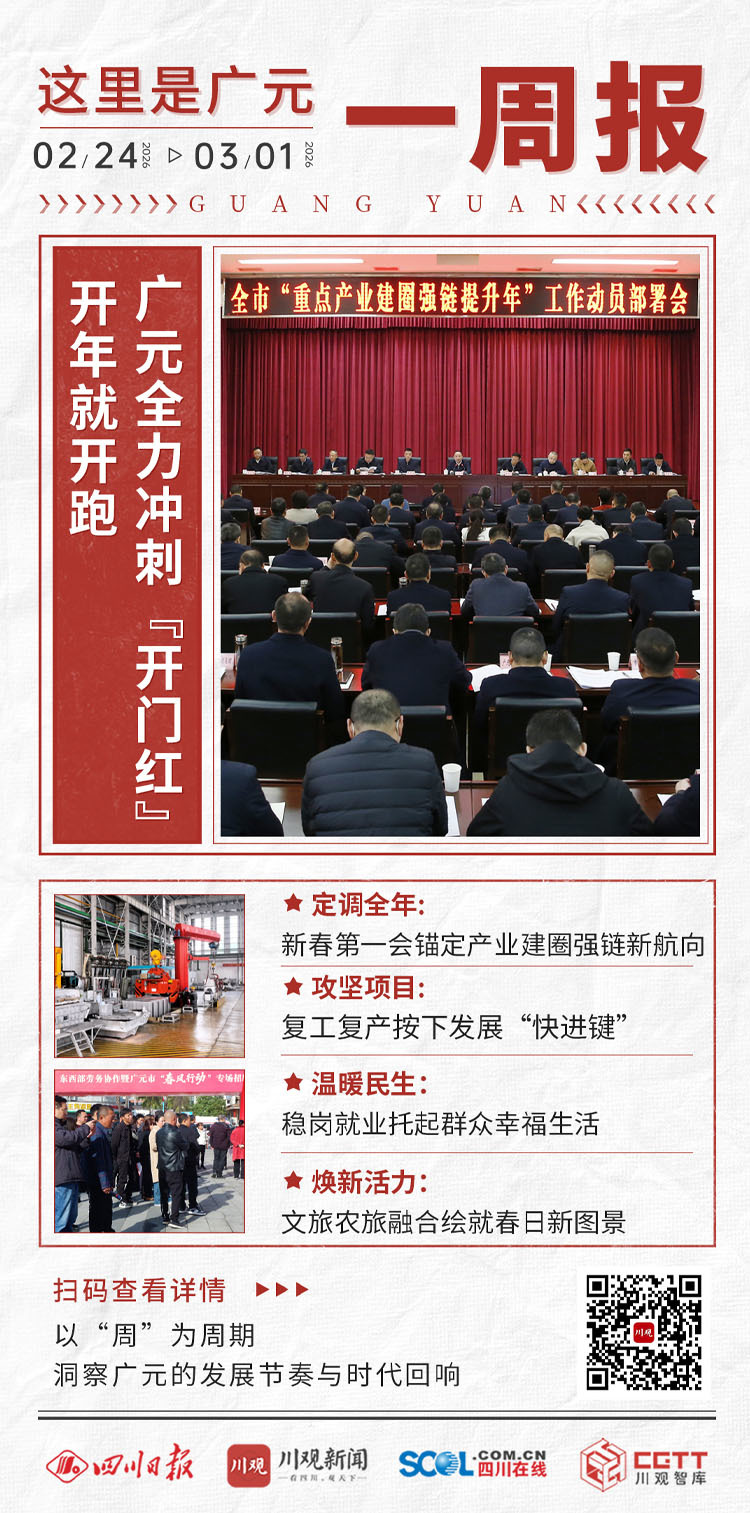 2月24日至3月1日,2026年第九周。春節假期的余溫尚未散盡,廣元已全面進入“開年就開跑、起步即沖刺”的奮進狀態。全市緊扣“1345”發展戰略,以實干爭先的勁頭在產業部署、復工復產、民生就業、文旅鄉村等領域全面發力,全力沖刺首季“開門紅”。