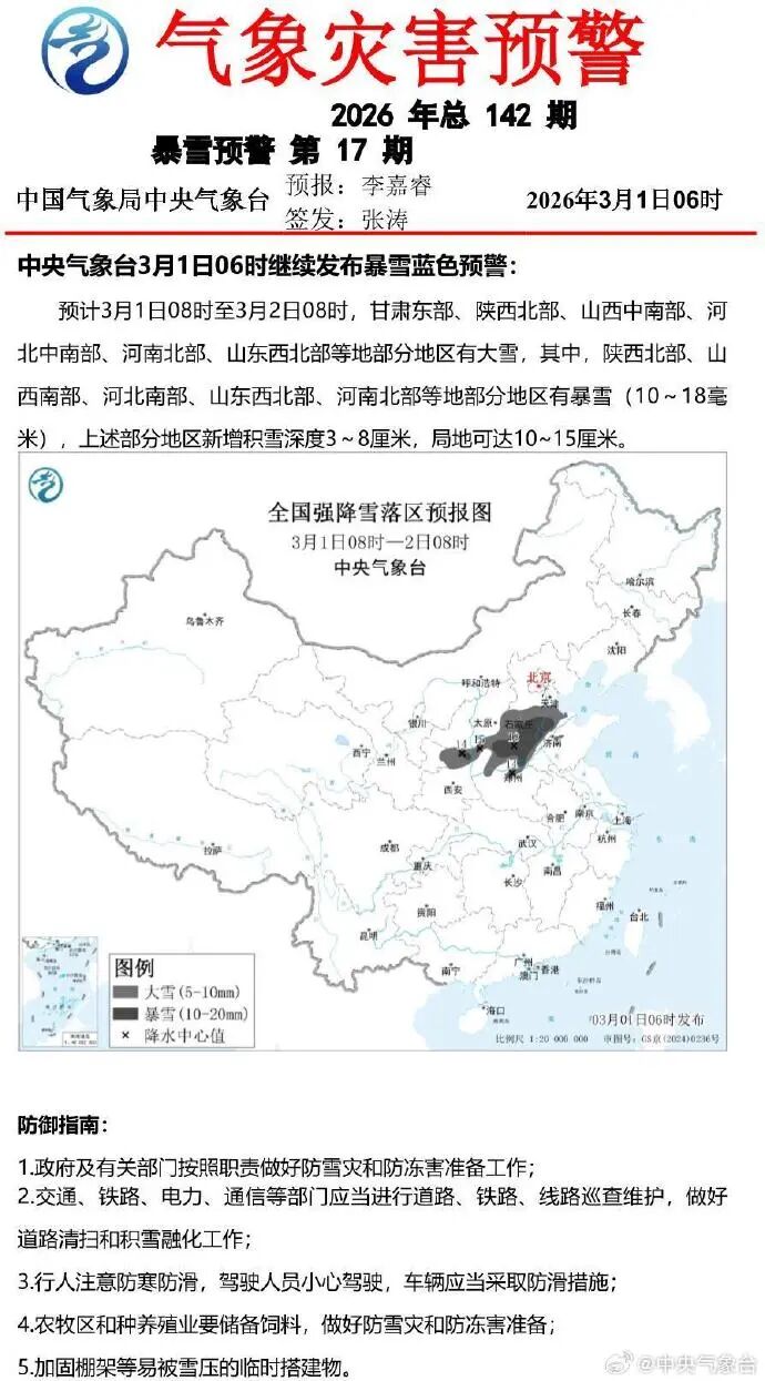 北方的雪又來了!中央氣象臺今天早上繼續發布了暴雪預警,預計今天8時至明天8時,甘肅東部、陜西北部、山西中南部、河北中南部、河南北部、山東西北部等地部分地區有大雪,其中,陜西北部、山西南部、河北南部、山東西北部、河南北部等地部分地區有暴雪。